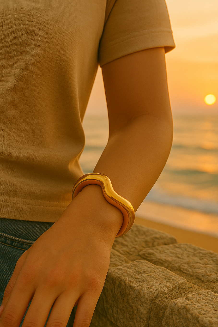 Ett elegant och modernt armband tillverkat i rostfritt stål med 18K guldplätering. De mjuka, organiska vågformerna skapar en tidlös och stilren look som gör detta till ett perfekt statement-armband. Bär det ensamt för en sofistikerad touch eller kombinera med andra guldarmband för en lyxigt avslappnad stil. Justerbar passform som passar de flesta handleder.
